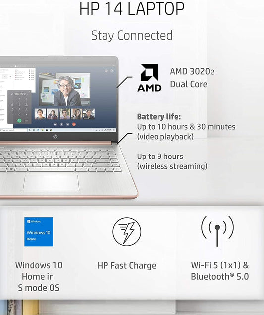 HP - 14-fq0060nr 14 Laptop, AMD 3020e, 4 GB RAM, 64 GB eMMC Storage, 14-inch HD Touchscreen, Windows 10 Home in S Mode, Long Battery Life, Microsoft 365, (14-fq0060nr, 2020) Pale Rose Gold