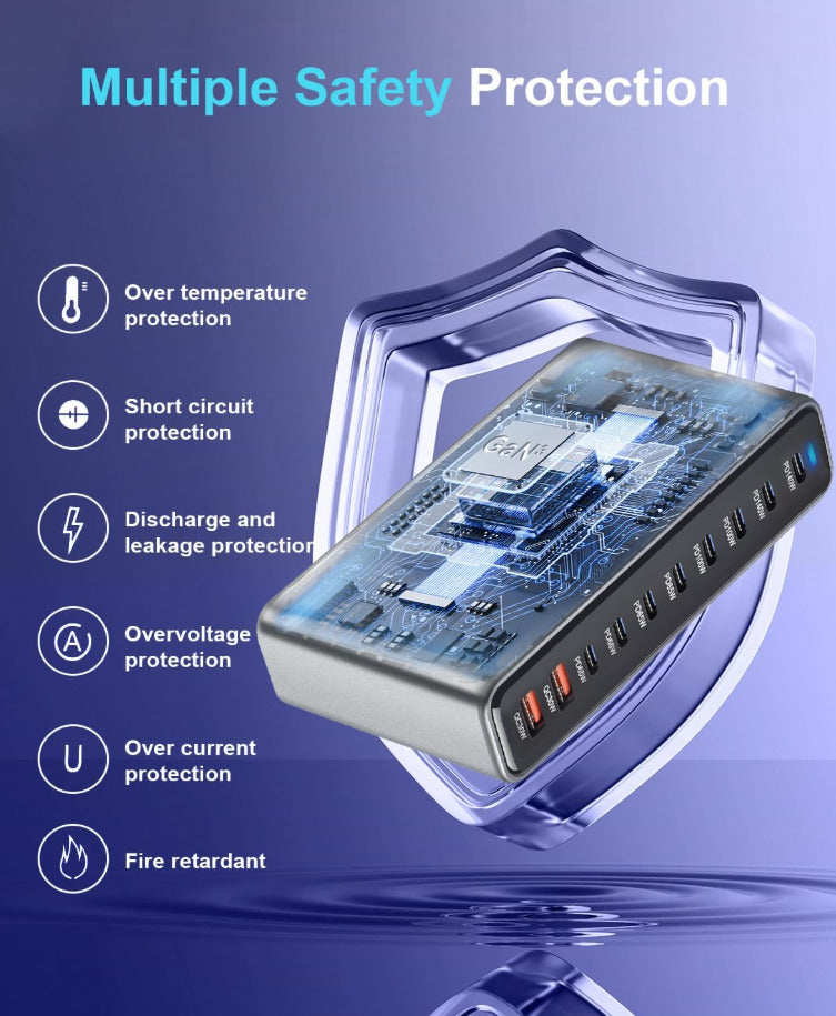 - 10-in-1 USB C Charging Station: The 800W USB C Wall Charger features 8 USB C ports and 2 USB A ports for powering phones, tablets, headphones, smartwatches, game consoles and more. No need to wait, you can quickly charge up to Multiple devices at the same time, and each port intelligently distributes power to ensure you get optimal charging efficiency!