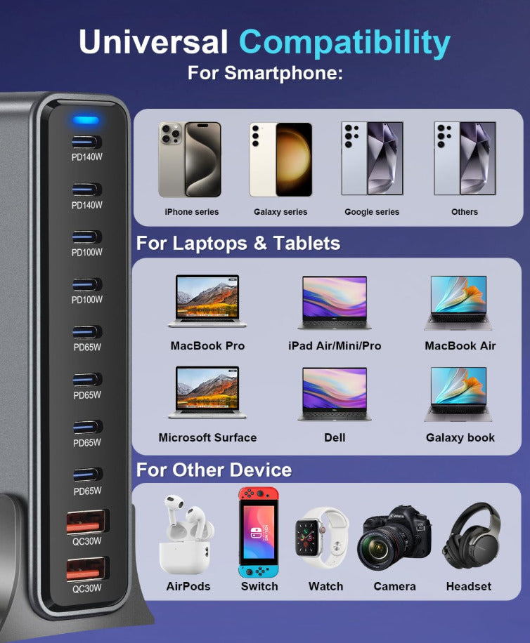 - Wide Compatibility: The 800W USB C charging station supports PD3.1,PD3.0/PPS, QC, PE2.0, AFC, FCP, SCP, 5V/3A fast charging protocols and is compatible with MacBook Pro 16“, 14”, 13”, MacBook Air, iPad Pro , iPhone 16 Pro/15 Pro/14 Pro Max/13/12, Switch, Samsung Galaxy S23 Ultra/S22, Steam Deck and more