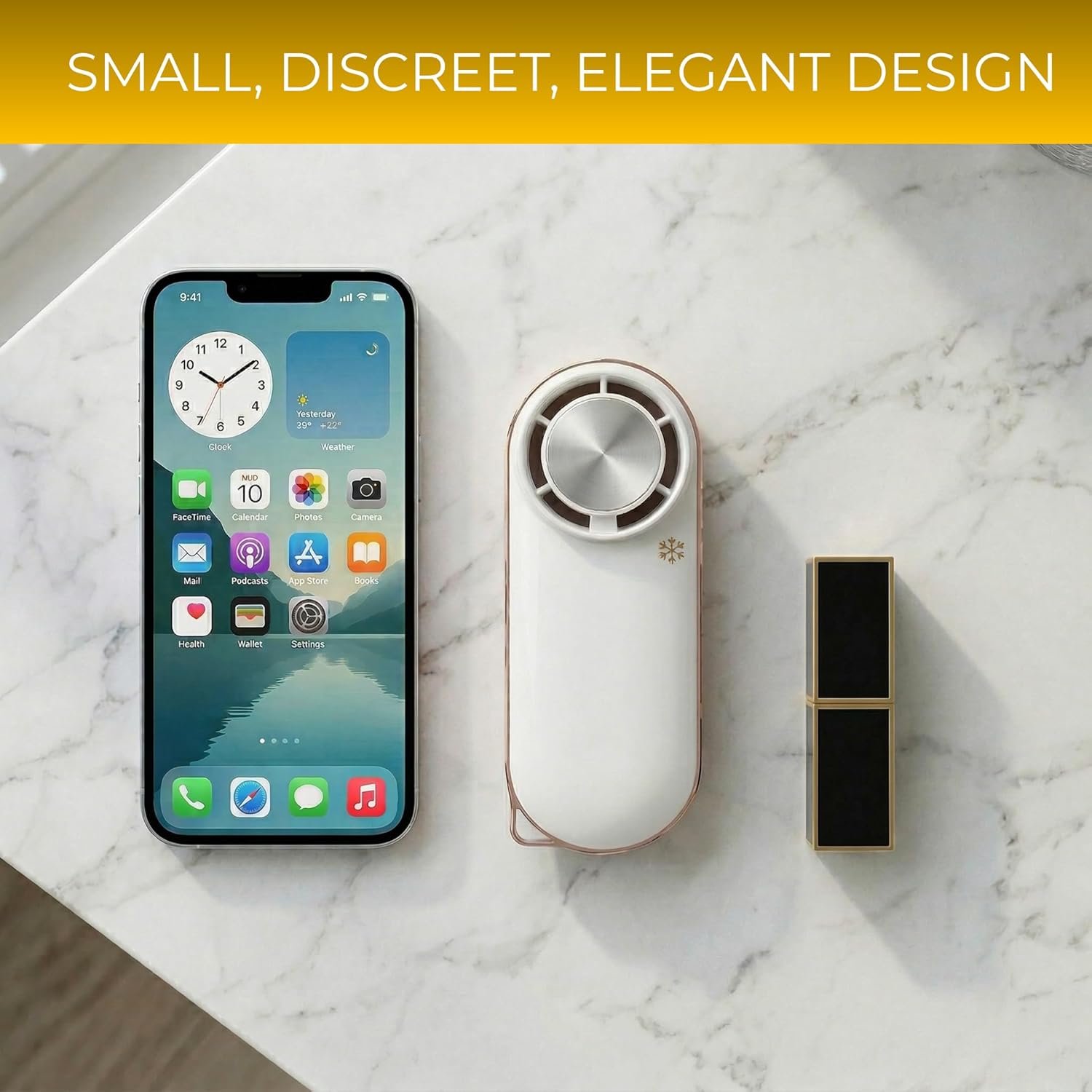 - INSTANT COOL RELIEF, ANYWHERE YOU GO: The icy cold compress in our rechargeable fan provides direct, soothing relief by placing the metal centerpiece directly on your skin, pulse points, forehead, neck, or wrists for immediate cooling and refreshing comfort. With a functional and sleek design measuring around 5 inches, our mini turbo fan easily fits in your pocket, purse, or backpack. Keep an extra one in your car so it’s always close by.