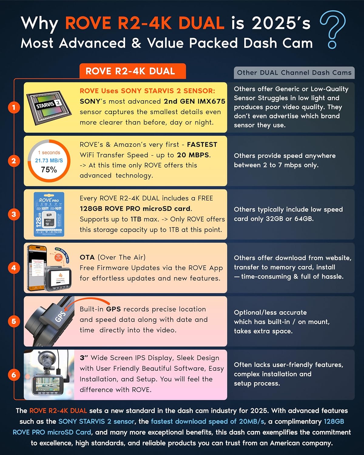 OVE R2-4K DUAL Dash Cam Front and Rear, STARVIS 2 Sensor, FREE 128GB Card Included