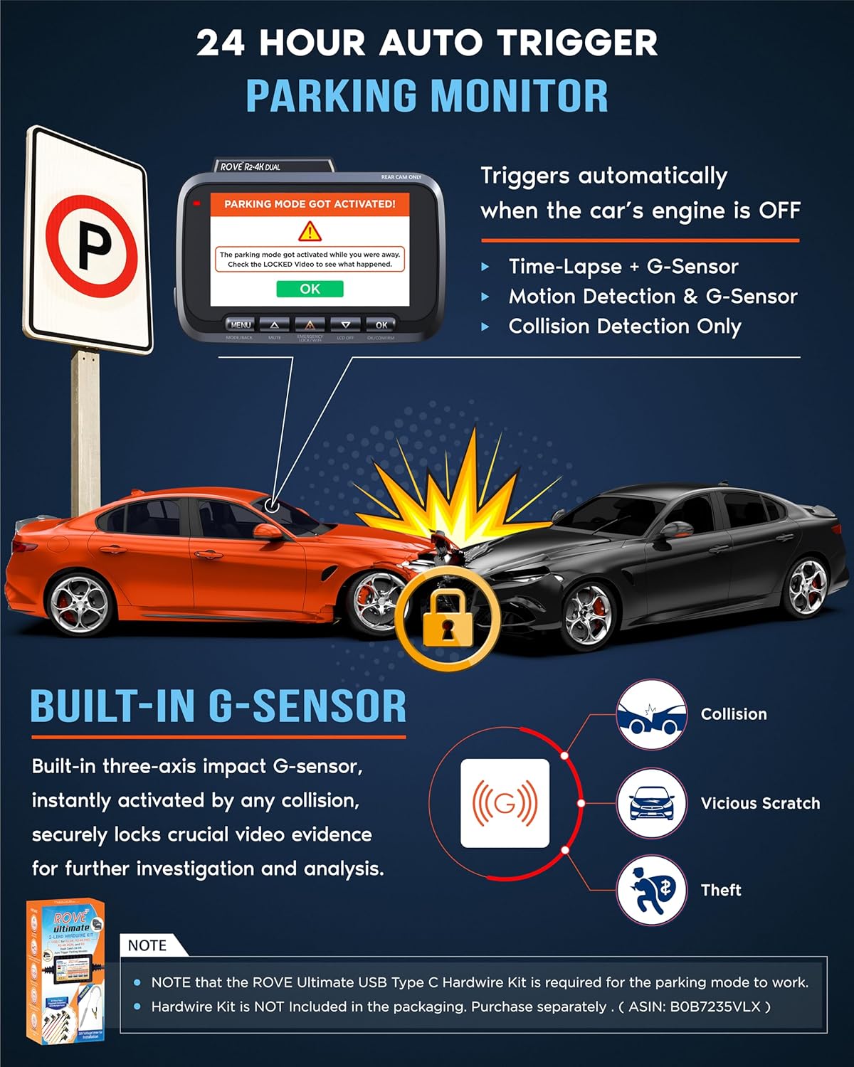 - 4K FRONT + 1080P REAR RECORDING – ROVE R2-4K DUAL dash cam offers dual-channel recording capabilities, capturing footage simultaneously from both the front and rear cameras. The front camera records at 3840x2160P @30fps, while the rear camera captures 1920x1080P @30fps footage, ensuring clear recordings of the road ahead and behind you. With a 150° ultra-wide angle for the front camera and a 140° angle for the rear camera, you'll capture more of the road with this 4k dash cam.